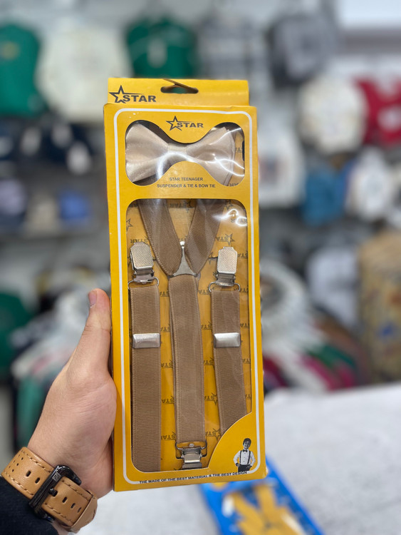 مدل Y رنگ کش کرم کارامل به همراه پاپیون کرم کارامل عرض کش 1/5 سانت کش پنبه ای ضد حساسیت فری سایز مناسب 6 تا 13 سال قابل تنظیم جعبه مقوایی 2 تکه یراق آلات فلزی با آبکاری نیکل رنگ سیلور