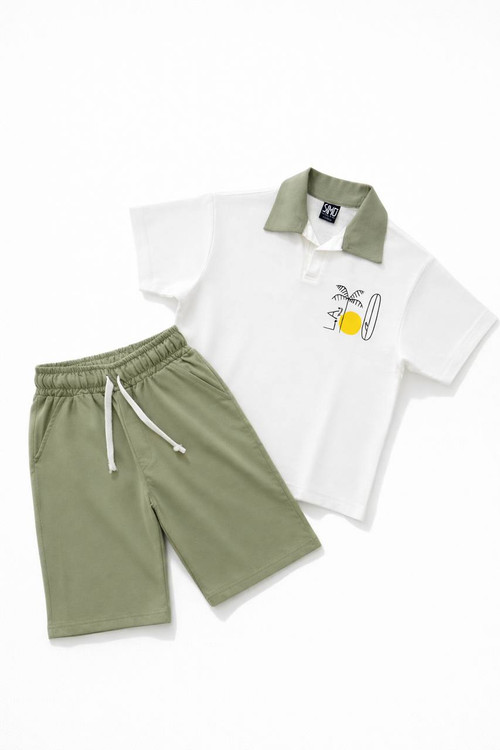 تیشرت پارچه دو نخ وارداتی یقه دار با یه چاپ بسیار با کیفیت به همراه شلوارک دورس زیر زانو که کمر کار می باشد و مناسب استایل های بیرونی می باشد